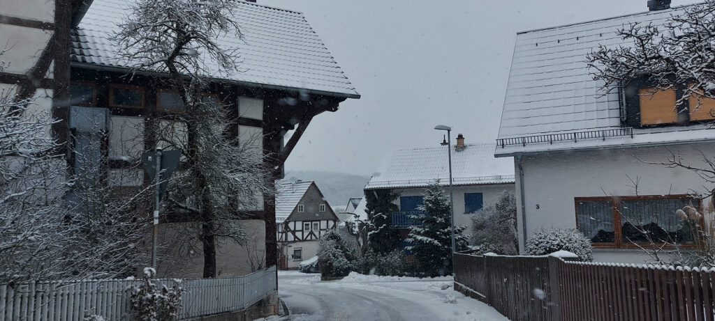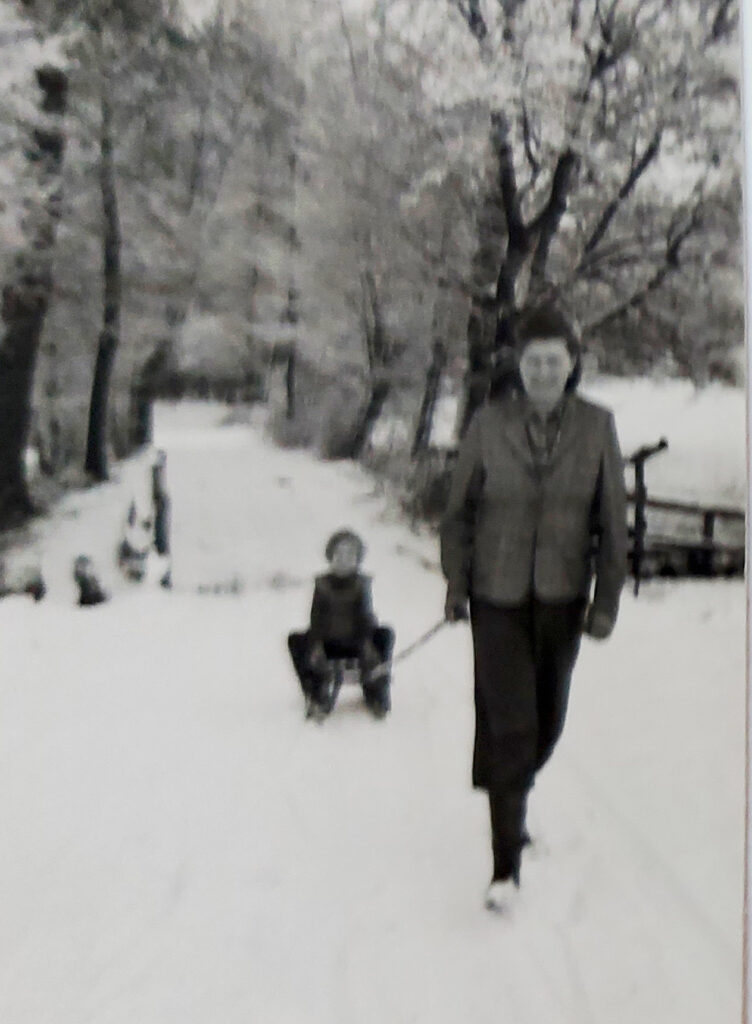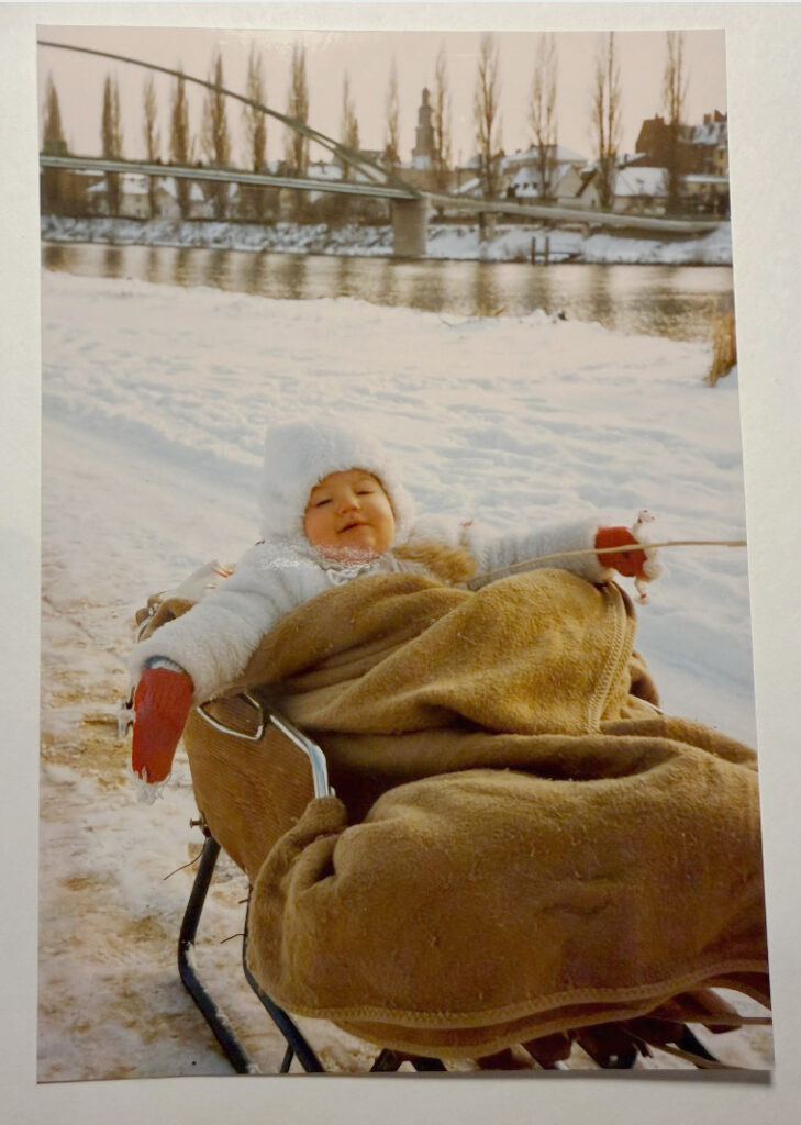 Ich erinnere mich an einen Schneemann, den meine Mutter für mich gebaut hatte, da war ich vier. Das Foto, wo ich selbst von meiner geliebten Herta gezogen wurde, entstand im Winter, bevor ich in die Schule kam. Es war in der Wesermarsch, wo gerade Tief Elli wütete. Daneben ein Foto aus Brandenburg mit Hund: Kontinentalklima. Und eins mit meiner Tochter vom Fastnachtsdienstag 1985. In der Nacht waren es -22°C gewesen – in Offenbach am Main. Unsere Tochter ist nicht erfroren.